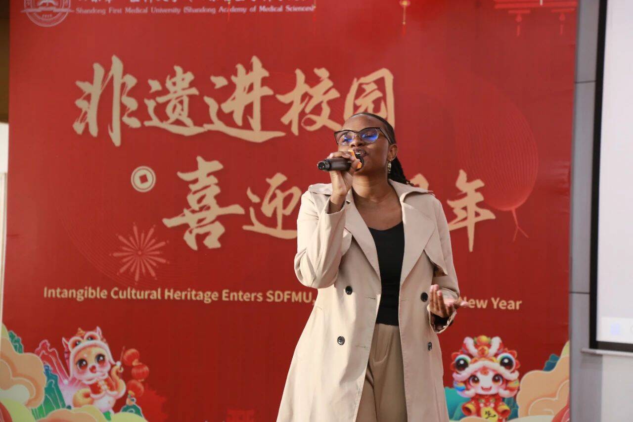 歌舞环节将活动氛围推向顶点。泰山旗韵艺术团、泰安市歌唱家协会以及多国留学生共同献上了一场视听盛宴。从中国传统的响扇舞到京味儿浓厚的经典曲目,再到留学生们的绚丽舞姿与青春旋律,每个节目都洋溢着热情和活力,展现了新时代中外青年携手共进的多彩风貌。巴基斯坦学生带来了传统歌曲《Guiabi Ankhein》和舞蹈《Nach Punjaban》,热情洋溢的表演展现了巴基斯坦文化的独特魅力。摩洛哥学生演唱了歌曲《HaBiBi》,悠扬的旋律令人陶醉。锡安火车乐队带来了歌曲《Mixup Song》,活力四溢的表演点燃了现场气氛。