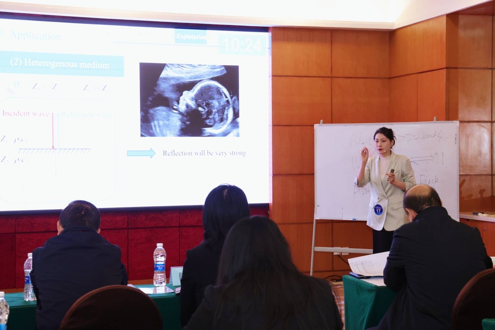 在授课展示环节,朱烨老师以“Medical Ultrasonic Image-forming Principle”为题,系统阐述了医学超声的基本原理。朱烨老师的课件结构清晰,逻辑层层递进;通过探头与压电晶体示意图,将抽象的声波产生机制转化为直观的物理模型,实现了抽象原理的可视化表达;在解释“无回声”“高回声”“低回声”时,直接关联血液、结石、脾脏等常见临床标的,案例贴近实际;在关键环节还设置了提问,引导学生主动思考而非被动接收。朱烨老师流畅的英语表达、扎实的专业功底、良好的跨文化教学能力赢得了在场专家的高度赞誉。最后,中国教育国际交流协会医学分会副理事长陈君教授为朱烨老师颁发了写实性证明,并充分肯定了山东第一医科大学在来华留学医学教育方面取得的成果。