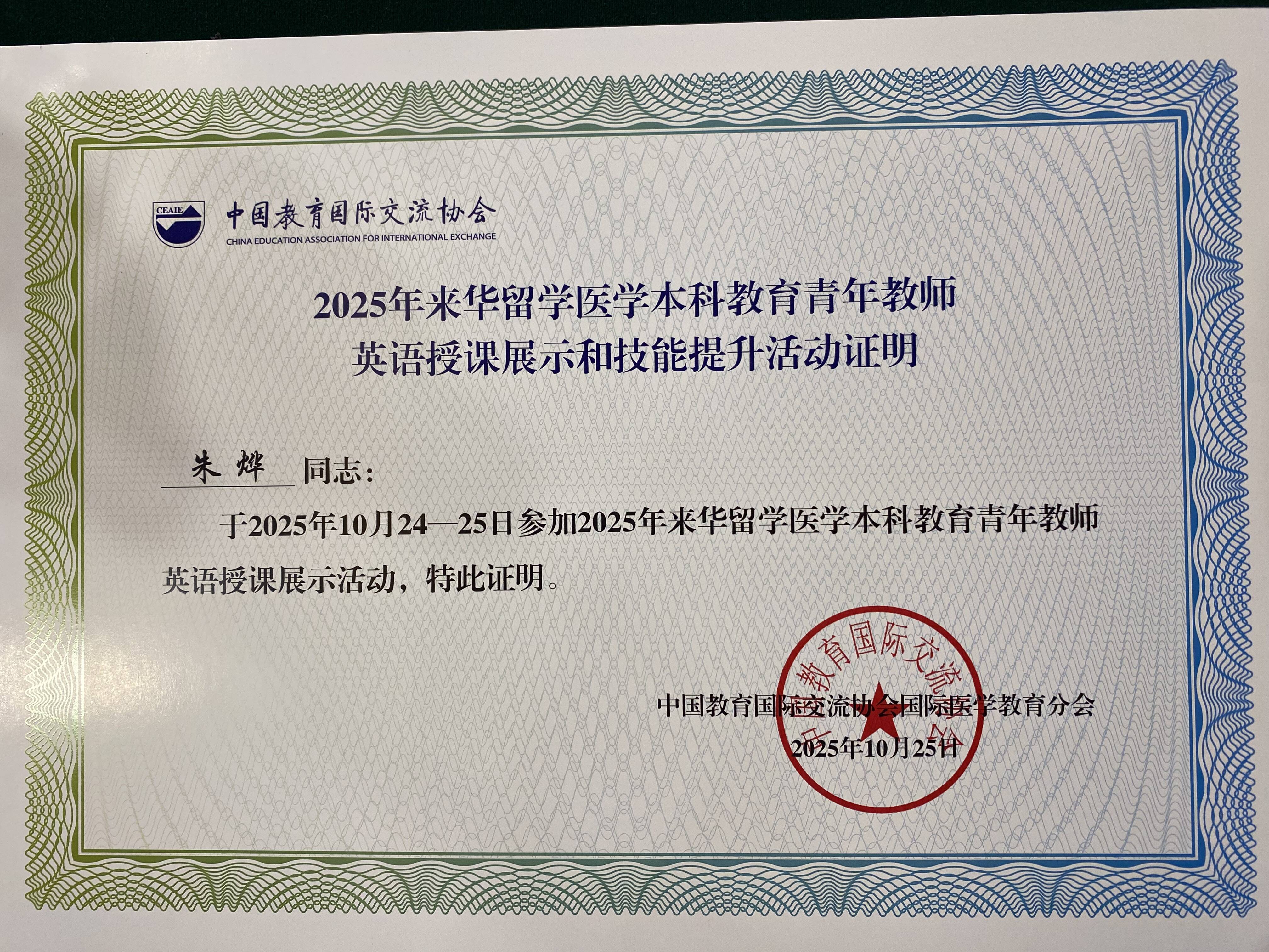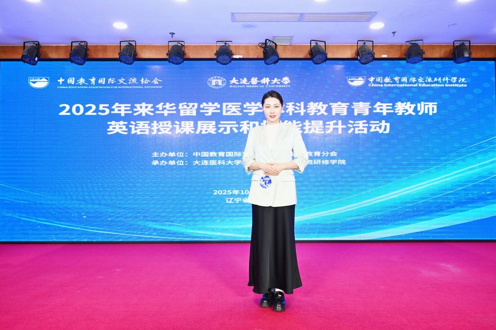 近日,由中国教育国际交流协会国际医学教育分会主办,大连医科大学国际教育学院、中国教育国际交流研修学院共同承办的2025年来华留学医学本科教育青年教师英语授课展示和技能提升活动在辽宁省大连市举办,来自全国47所高校的来华留学医学青年教师代表参与展示活动。校(院)来华留学生任课教师来自放射学院的朱烨老师代表我校参加活动。