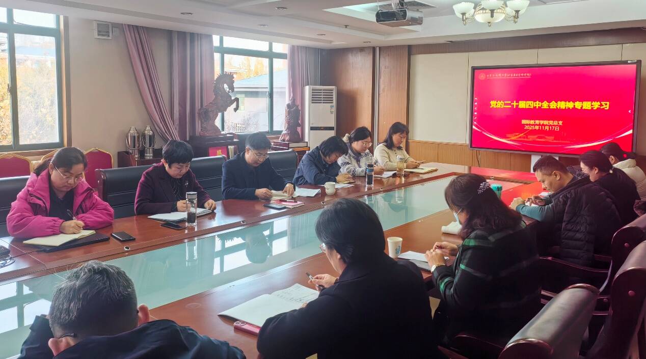 近日,国际教育学院党总支召开专题会议,深入学习贯彻党的二十届四中全会精神。党总支书记辛文勇主持会议。会议集中学习了《中国共产党第二十届中央委员会第四次全体会议公报》和《中共中央关于制定国民经济和社会发展第十五个五年规划的建议》。