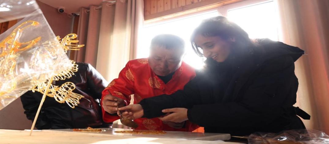 糖画体验环节同样趣味盎然。市级非遗传承人张德友以马、龙等典型符号为题材,现场展示糖画“一笔成型”的高超技艺,并讲解其中“映福纳吉”的美好寓意,使留学生们直观感受到了“甜满新春”的民俗意趣。